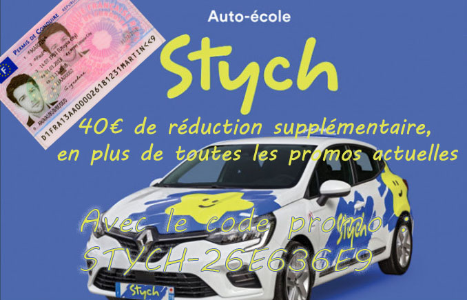 Franchement, j'ai hésité et en fin de compte je ne regrette pas. Vu que c'est 2 fois moins cher que dans les autres auto école. Alors, pour gagner du temps j'ai commencé la conduite avant d'avoir le code, bon j'avoue que je connaissais un minimum le code. Mais je trouve que c'est plus motivant de faire code et conduite. Mardi j'ai passé le code (5 semaines après mon inscription). Résultat : 38 sur 40 ! J'avais fait tous les examens blancs jusqu'à avoir 35 au minimum. J'ai aussi lancé des défis à d'autres personnes etaient inscrites (la aussi c'est bon pour la motivation) La il me reste la conduite, il me reste une 10h d'heure à faire et j'en ai programmé 6 pour la semaine prochaine ! Ah oui avec stych, on choisit son formateur, et c'est nous qui faisons notre planning ! Et on peut annuler 48 h avant sans frais. STYCH-26E636E9 (un code parrain au cas où) Maintenant je passerai éditer mon avis quand je passerai la conduite !