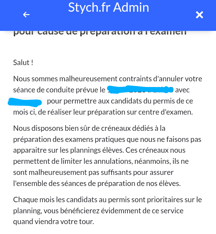 J'ai démarré le permis en mai 2023,et je suis toujours en attente d'une place d'examen, malgré d'innombrables rappels et mail,pas de nouvelles.J'ai pourtant souscrit une offre dite premium visiblement ça ne change rien par rapport a une offre classique au vu du suivi catastrophique. Mon code expire bientôt,si je ne passe pas le permis très rapidement je vais devoir tout recommencer.J'ai beau essayer de planifier des cours de conduite,on me les annules dans la foulée pour faire passer l'examen a d'autres élèves :la blague quoi.Merci Stych !